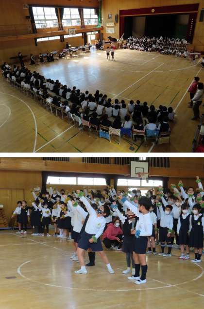 今日は、2年生と5年生が講堂に集まって、音楽を通して交流をしました。