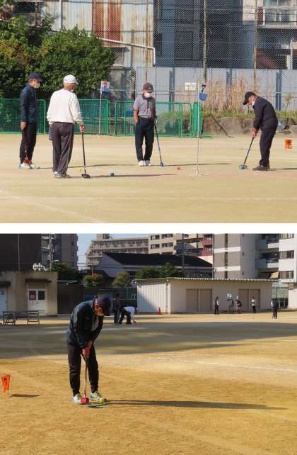 土曜日の運動場では、地域の方がグランドゴルフをしていました。