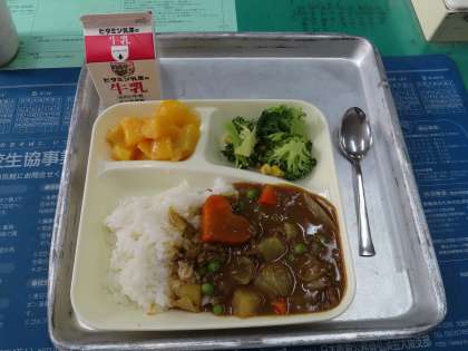 今日の給食は『冬野菜のカレーライス ブロッコリーとコーンのサラダ 黄桃』です。
