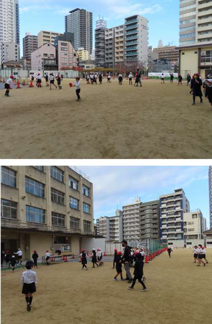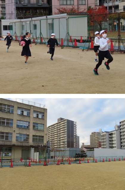 運動場も狭くなりましたが、子どもたちは元気に過ごしています。