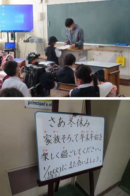 その後、教室では、先生から通知表ももらったり、冬休みの宿題などのお話を聞いたりしていました。