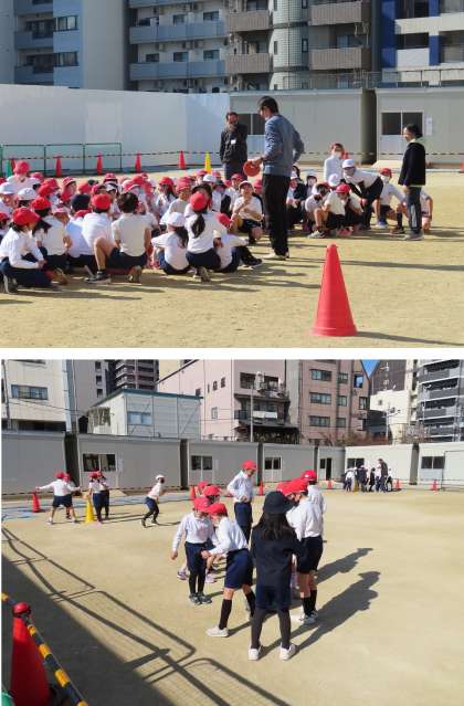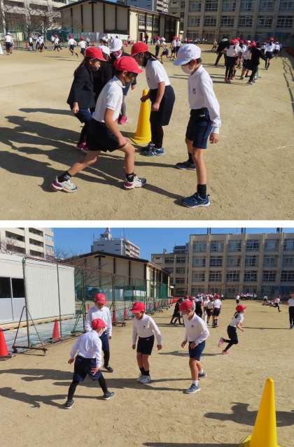 3年生が、手や足でジャンケンをしながら、ゴールを目指していました。