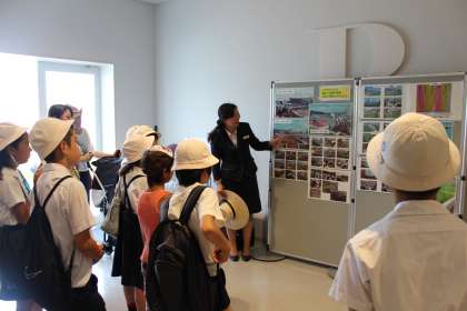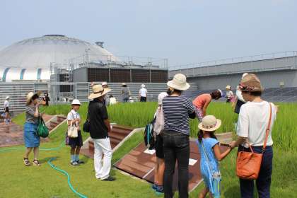 まず、田んぼに出て、稲や水田の生き物の観察等をしたあと、保護者と子どもたちが一緒に館内を見学しました。