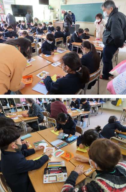 教室では、『からくりシート』の絵をクレパスなどで一生懸命に描いていました。