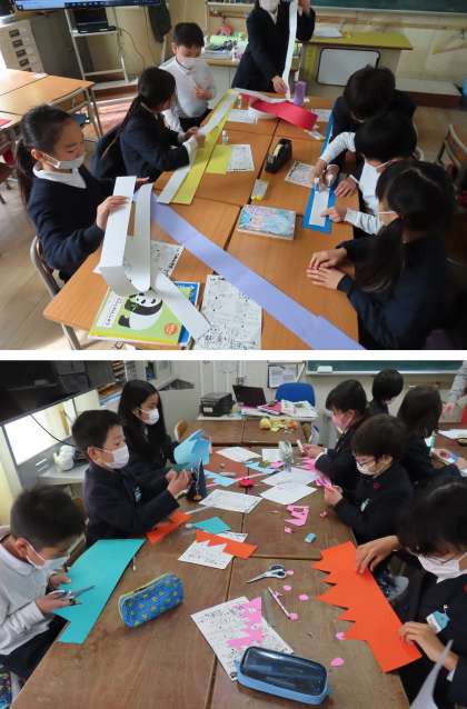 昨日の2時間目、1〜5年生のベストフレンド班で集まり、『卒業をお祝いする会』の準備をしました。