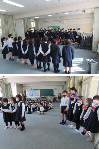 今日は、1年生が、6年生へ今までのお礼を言ったり、一緒に遊んだりしたい思いを『6年生ありがとう集会』という形で行い、6年生を多目的室に招待しました。