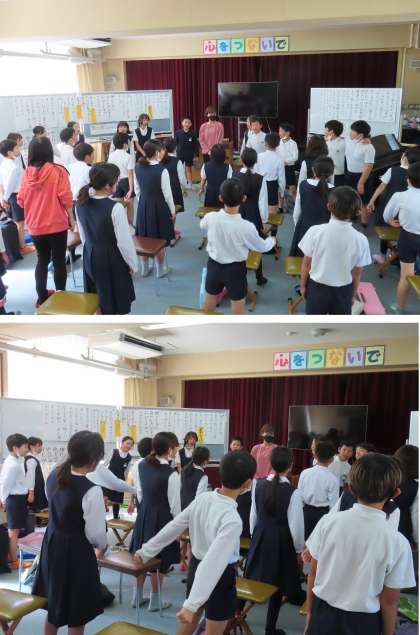 今日の4年生の音楽の授業のめあては、『感謝の気持ちを歌で伝えよう』です。