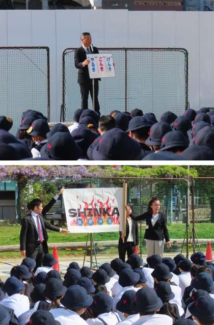 まず最初に転入生の紹介、そして、12名の今年来られた教職員の方を紹介しました。