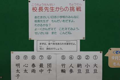 校長先生から、職員室前に張り出されている問題です。職員室の前を通るとき、運動場側の壁の方を見ましょう。漢字の読みの問題が出されていますよ。みんなはもう読めたかな。
