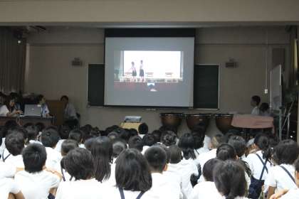 夏休み前に、6年生はスマートフォンや携帯についてのアンケートに答えていましたが、それらをもとに、中学生が授業の内容をまとめ、映像を使いながら説明をしてくれました。自分たちの周りには情報機器がたくさん存在しますが、特に「ライン」でのトラブルを取り上げての講義でした。文字足らずから誤解を生んだり、思わぬ方向にどんどん広がったり、嫌な思いをめいめいがする例を紹介され、子どもたちはその怖さを実感したことと思います。