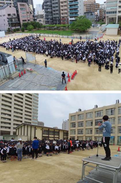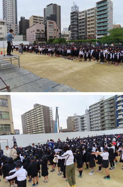 今日の全校朝会では、1年生も一緒に並び、全員集合しました。