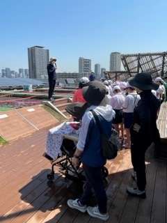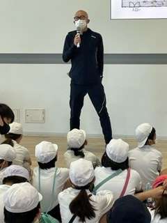 今年も5年生がハグミュージアムで田植え体験をします。館長さんのお話を聞いて田んぼに向かいます。