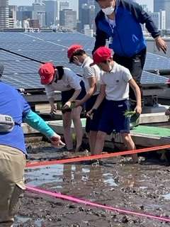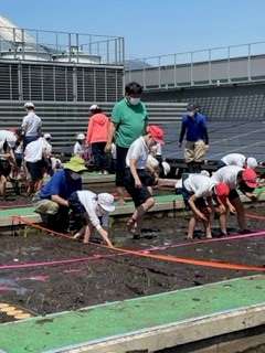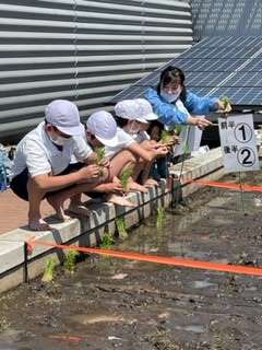 裸足で田んぼに入るのは、少し勇気が必要ですが、教わった通りに、真剣に田植えに取り組みます。