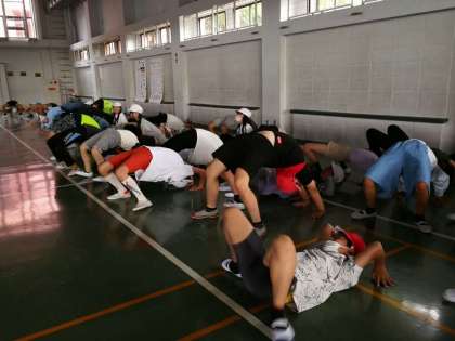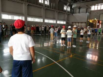 部屋で着替えたあと、避難訓練も兼ねて、体育館に集合しました。
