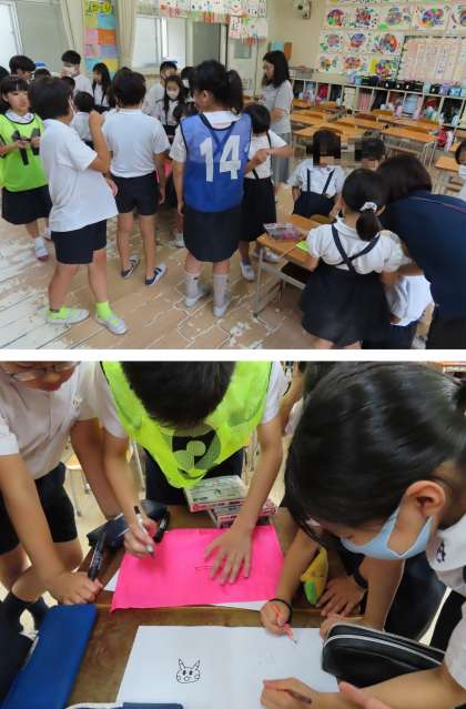 今日の朝の時間、ベストフレンド班(BF班)で、前にしていた『旗づくり』の続きをしました。