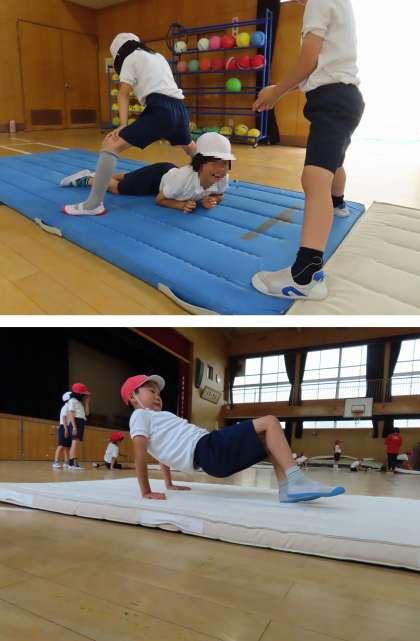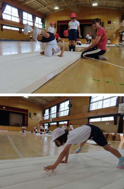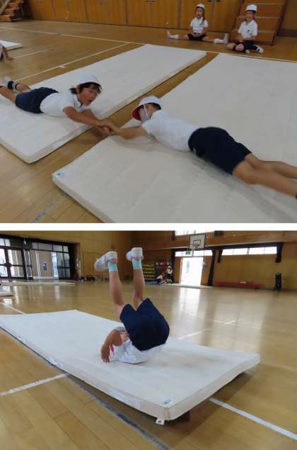 講堂では、2年生がマットを使って運動をしていました。