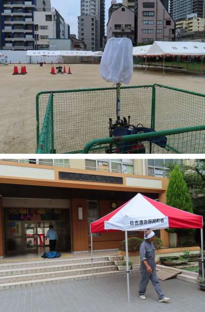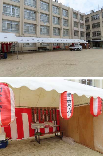 学校では、明日からの『日吉夏祭り』の準備を地域の方がしてくださっています。