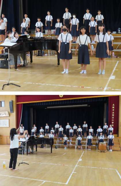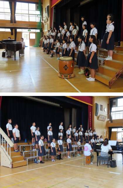 今日は、夏休みの成果を先生方や保護者の方にも見て聞いていただきたいと、コンクールで歌う歌を2曲、講堂で披露しました。