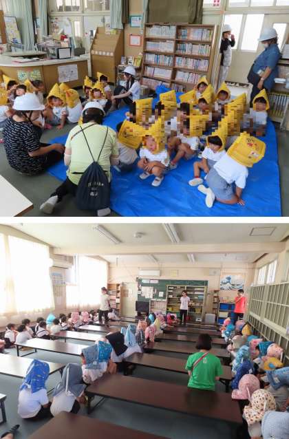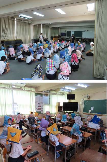 3階以上の自分の教室に避難する子もいますが、2階の教室の子や幼稚園児などは、多目的室な図書室などに避難するようにしました。