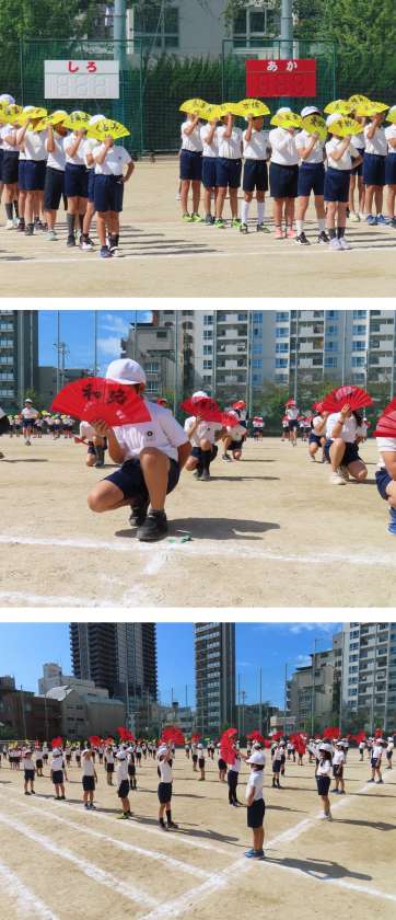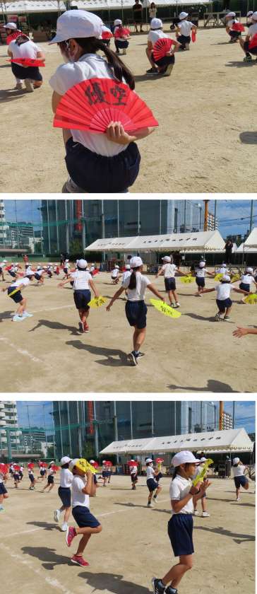 4年生は、手に扇子(せんす)。クラスごとに色が違うそうです。