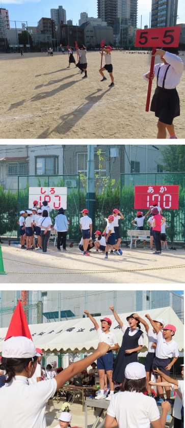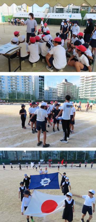 6年生の練習が終わった後、教職員や応援団、ブラスバンドクラブの子どもたちも集まって、明日の運動会の準備をしました。
