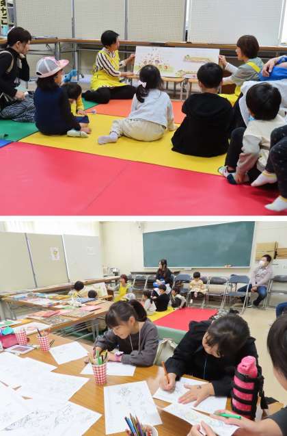 会議室では、読み聞かせサークル『おひさん』が、読み聞かせをしてくれたり、ぬり絵ができる場所を用意してくれていました。