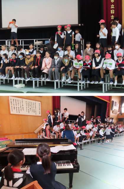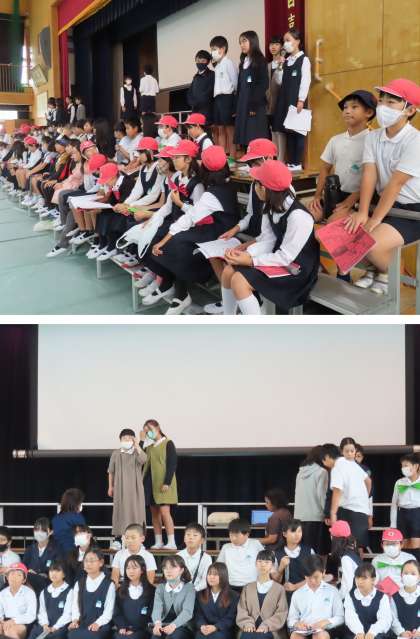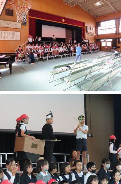 英語のセリフをしゃべるグループ、日本語訳を話すグループ、舞台で演じるグループと分かれて、一つの劇を作っていました。