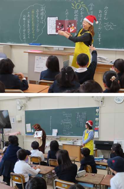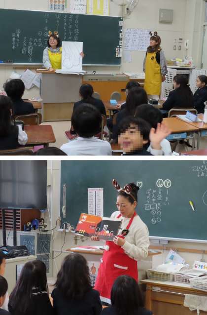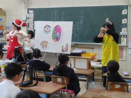 今日は、2年生の教室で、『おひさん』によるクリスマスバージョンの「お話し会」がありました。