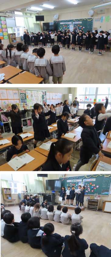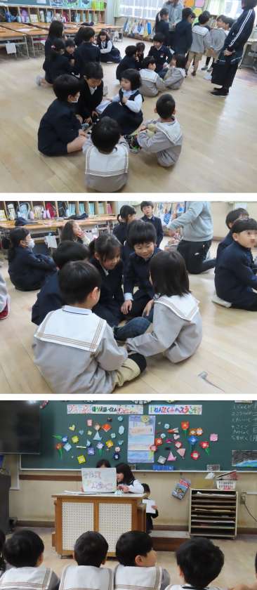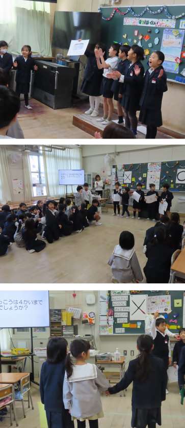 国語で勉強した詩を群読したり、学校や自分たちのことをクイズや紙芝居で紹介したり・・