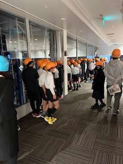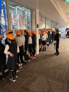 見学時は、安全のため、ヘルメットを着用します。
