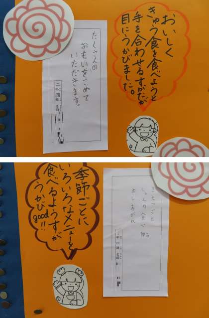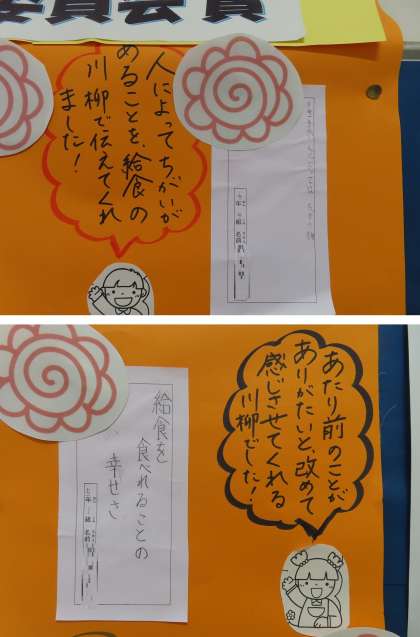 給食週間の時に募集した『給食川柳』が、1階廊下に掲示されています。