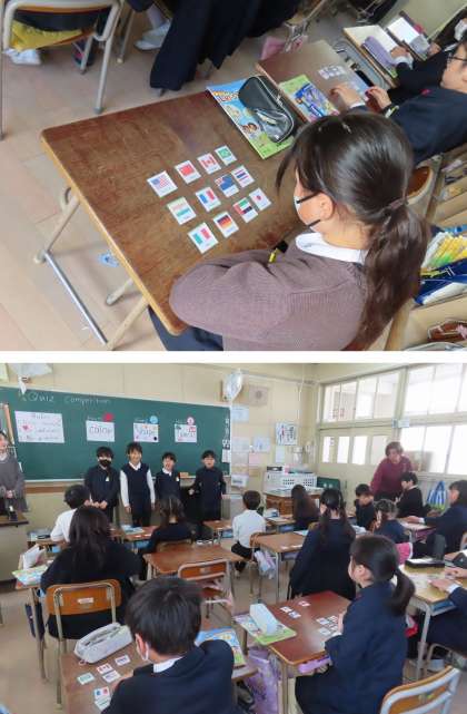 国旗の色や形、有名なものをヒントにして、国の名前を答えていました。