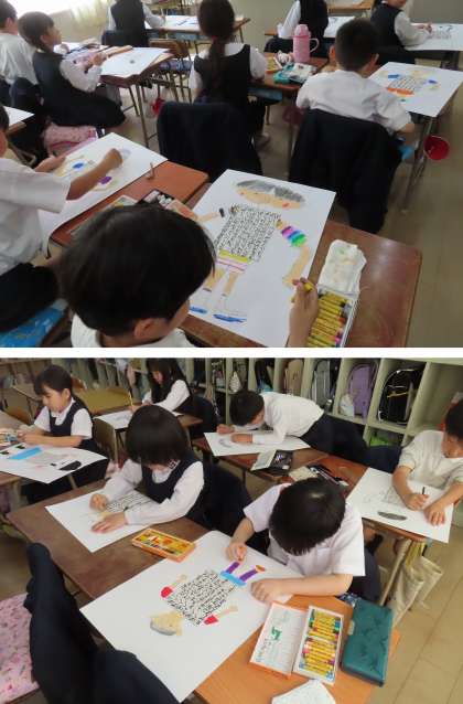 2年生が、自己紹介を書いた作文を胸に張った絵を、クレパスで描いていました。
