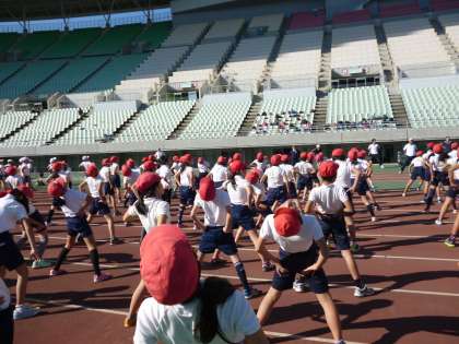 国際大会が行われる本格的な陸上競技場の大きさに圧倒された子どもたちでしたが、同じ学年の他校の子どもたちには負けまいと、持てる力を振り絞っていました。