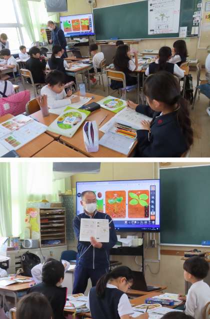 そこで、デジタル教科書を見ながら、「子葉」や「葉」の形や色が違うことを見つけていました。