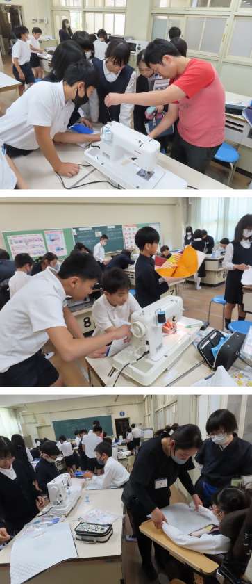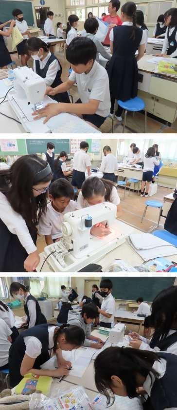 友だちとも協力しながら、ミシンに糸をかけて直線に縫ったり、折り返し縫いをしたりしていました。