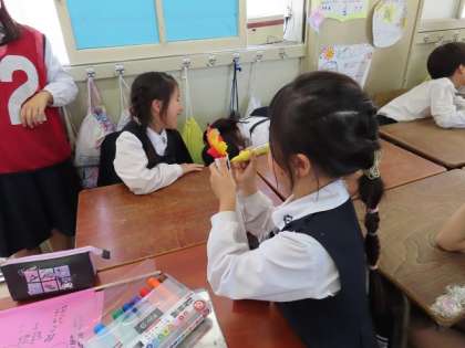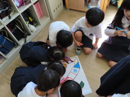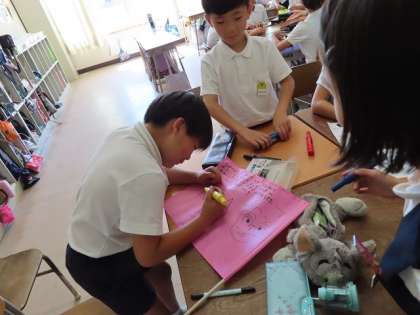 今日5時間目にベストフレンド班活動がありました。150周年全校集会に向けて、巨大ケーキに乗せるろうそくをつくりました。班ごとにお誕生日メッセージと名前を書きました。同時にスローガンを班ごとに1文字仕上げました。明日からの集会で集合するときに使う旗づくりも仕上げました。どのグループも異学年で仲良く過ごしていました。