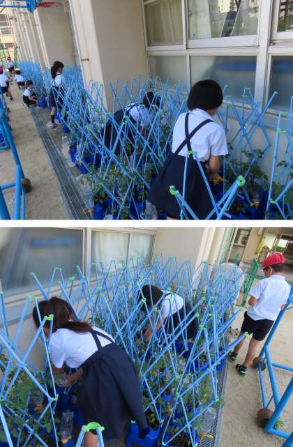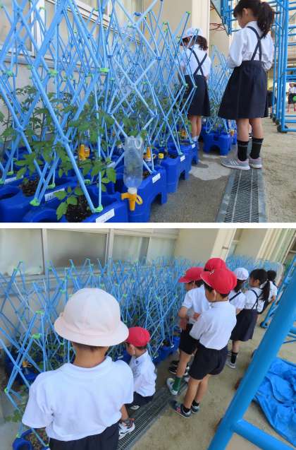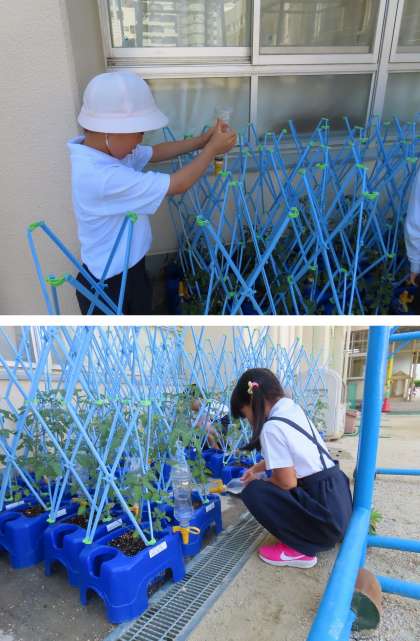 2年生が、毎朝ミニトマトに水をあげています。
