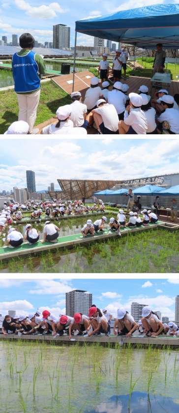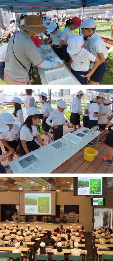 今日は、5年生の子どもたちがハグミュージアムに行って、春に植えた苗や田んぼにいる生き物の観察をしました。