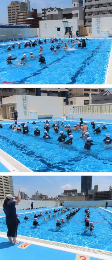 例年より1週間早めての実施ですが、気温も30度近いため、子どもたちは、プールの水にもすぐ慣れて、よろこんでいました。