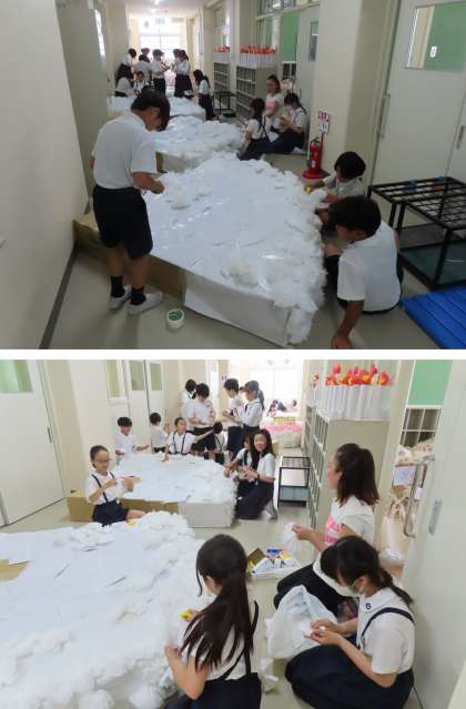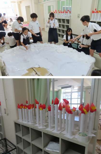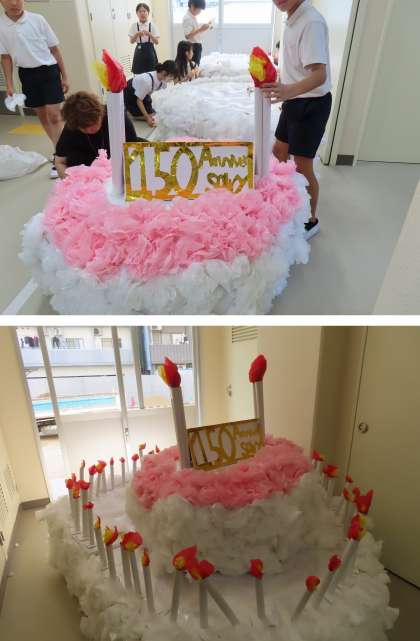 5年生の子どもたちが手伝ってくれて、明日集会で使う『150歳バースデーケーキ』の最後の飾りつけをしました。