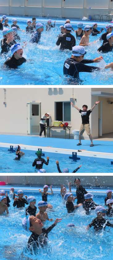 先生の言う通りに水浴びをし、リズムに合わせて水の中で手足を動かし踊っていました。