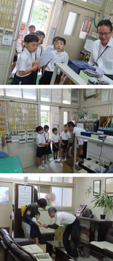 1年生が『校内たんけん』で、職員室や校長室のひみつを探しに来ました。