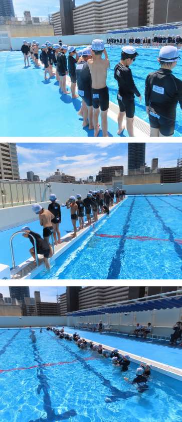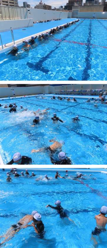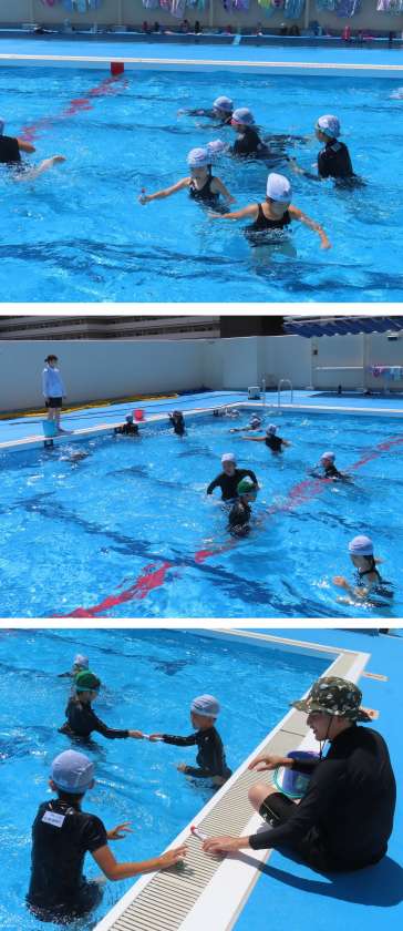 ホースで子どもたちに水をかけたりしながら、プールの授業を行いました。
