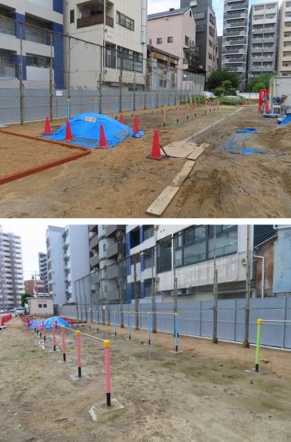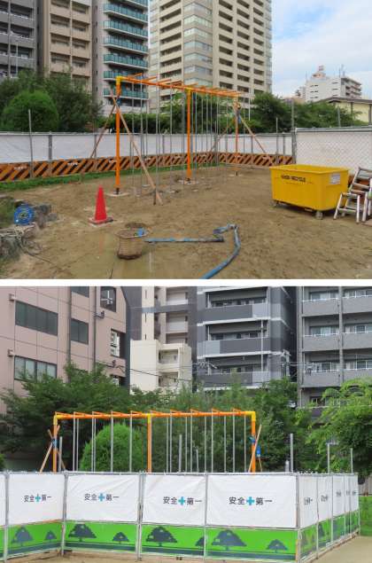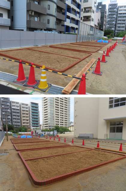 運動場の西側に作っている学習園・鉄棒・登り棒が仕上がってきました。