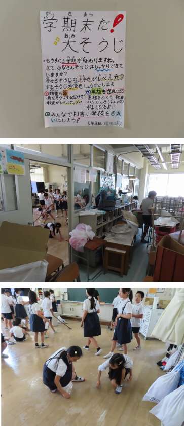 環境委員会のポスターが掲示されていて、大掃除を本格的にしているクラス・・