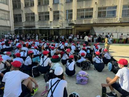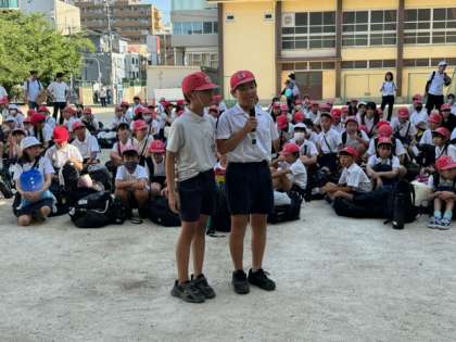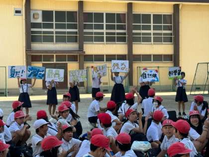 今から6年生は、自然体験学習で府立海洋センターに向けて出発します。