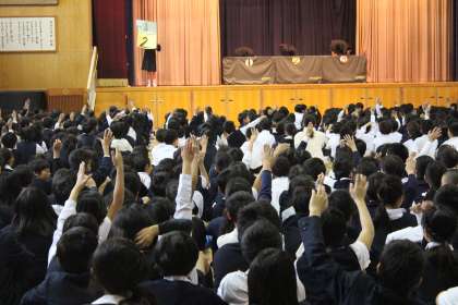 三択クイズの好きな子どもたちと、集会委員会のアイディアが、毎回、楽しく盛り上がる集会を作ってくれています。