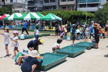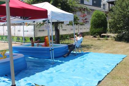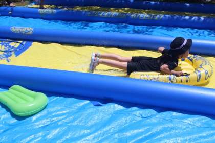日吉サマーフェスティバルはじまりました。ウォーターカーニバルは今、1,2年生の時間です。水をかけあったり、すべったり、楽しそうです。