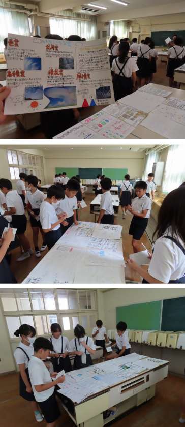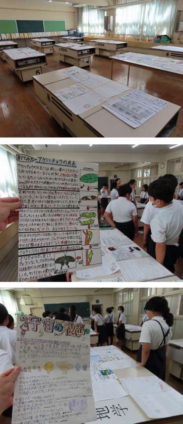 その作品を物理・化学・生物・地学の4分野に分けて、理科室に並べられています。